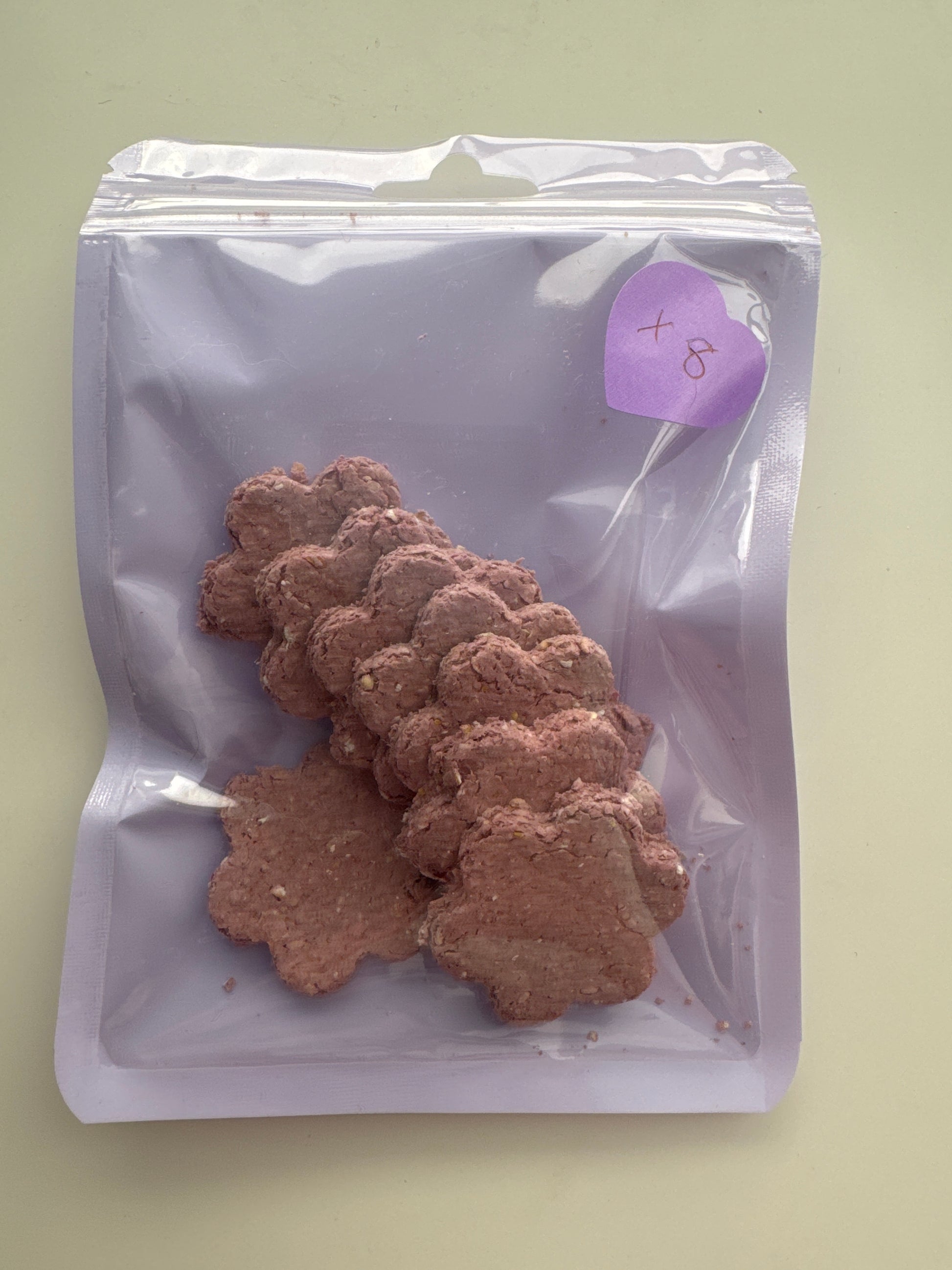 This Apple & Raspberry Treat is the perfect combination of organic oats and real fruit flavors. Handmade with care, each treat may have a slight difference in shape or size, ensuring a unique experience every time. Indulge in this delicious and nutritious snack, made with all-natural ingredients. Each pack contains 8 medium sized treats.