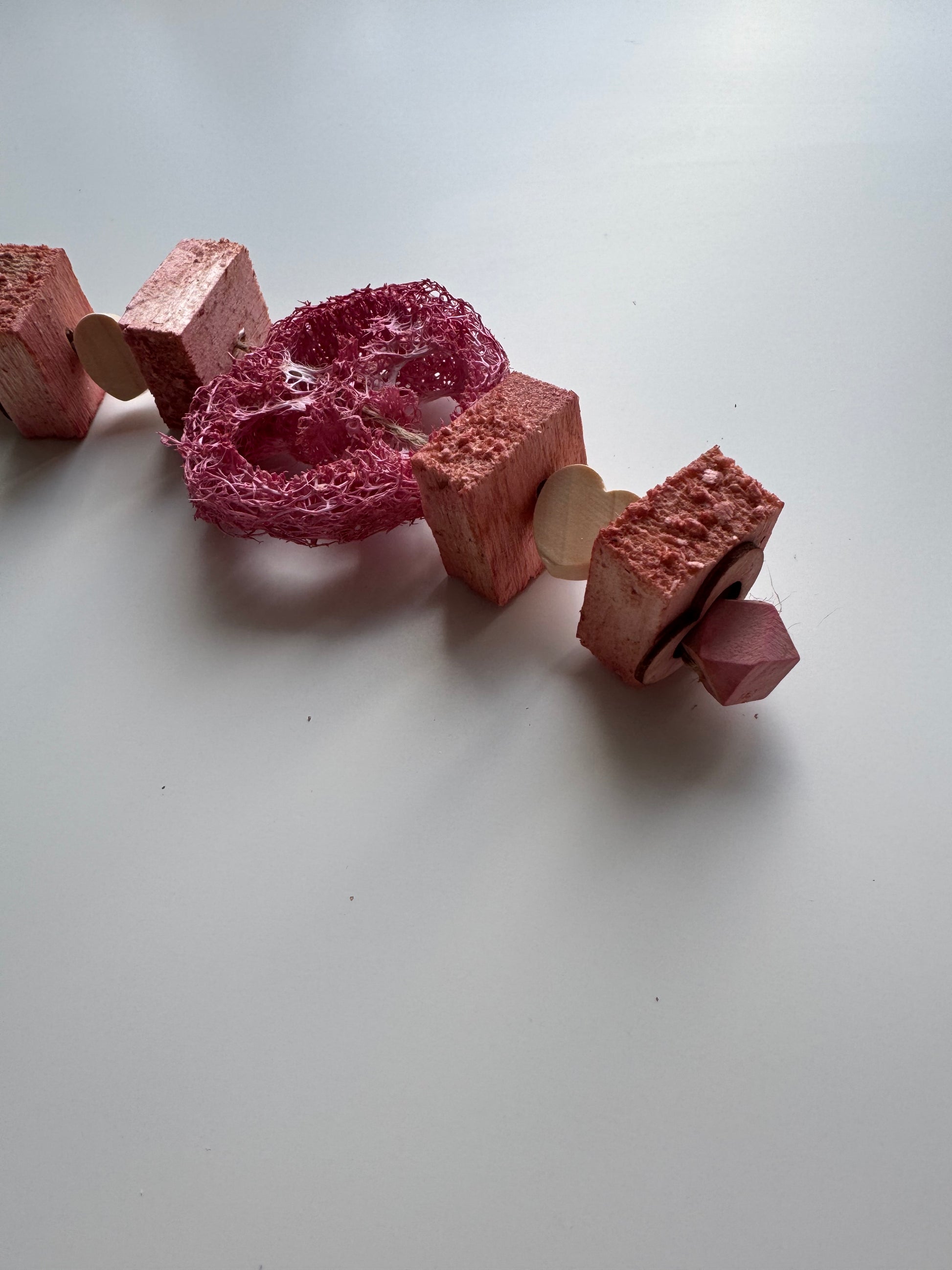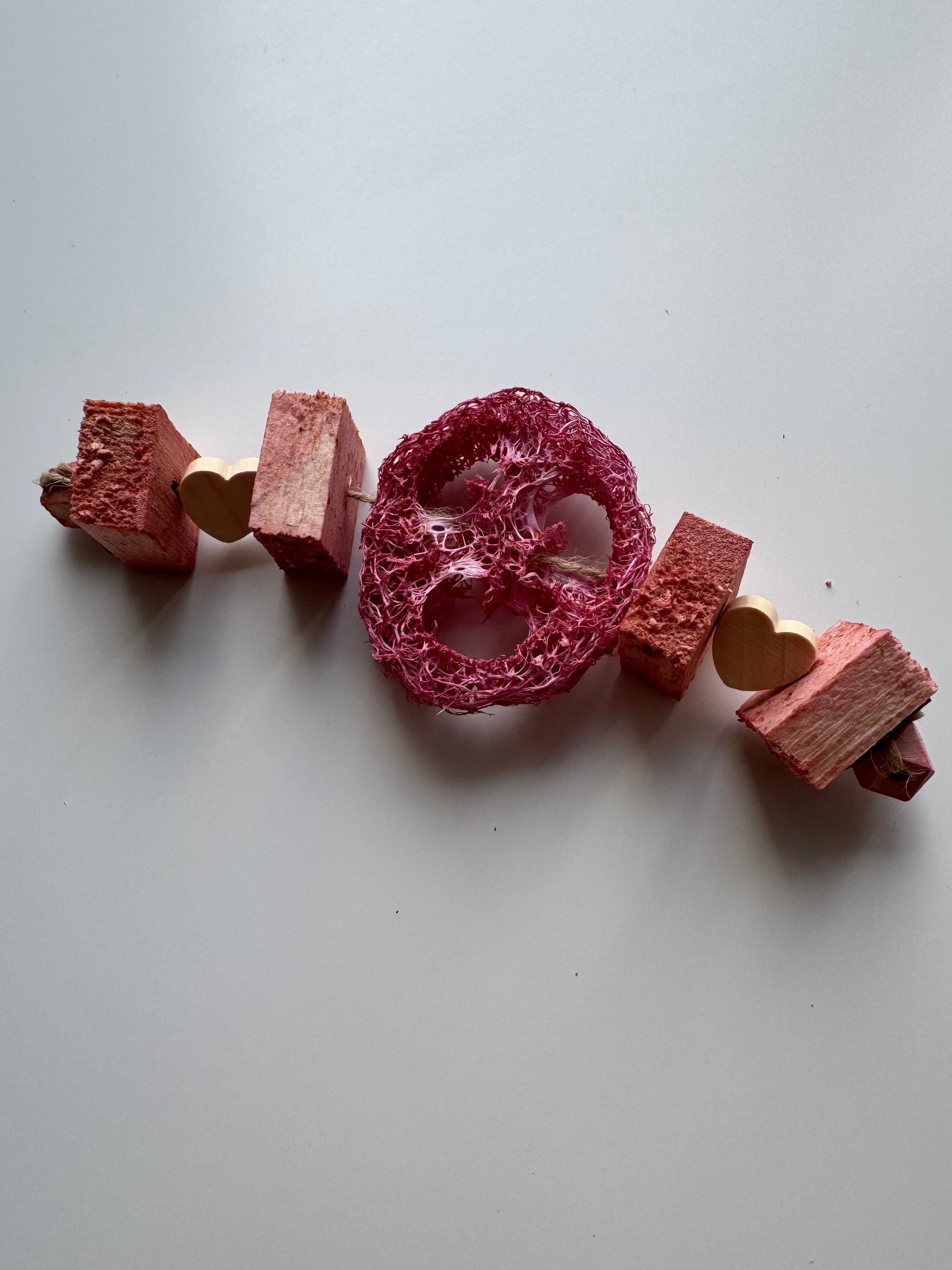 The Loofah Love Throw Toy is a safe and healthy option for your rabbit's chewing needs. Designed to promote healthy teeth and prevent boredom, this throw toy is a must-have for any rabbit owner. With its durable design and safe materials, you can rest assured that your furry friend will love playing with this toy. Featuring balsa wood, pine wood, a natural loofah and jute twine.